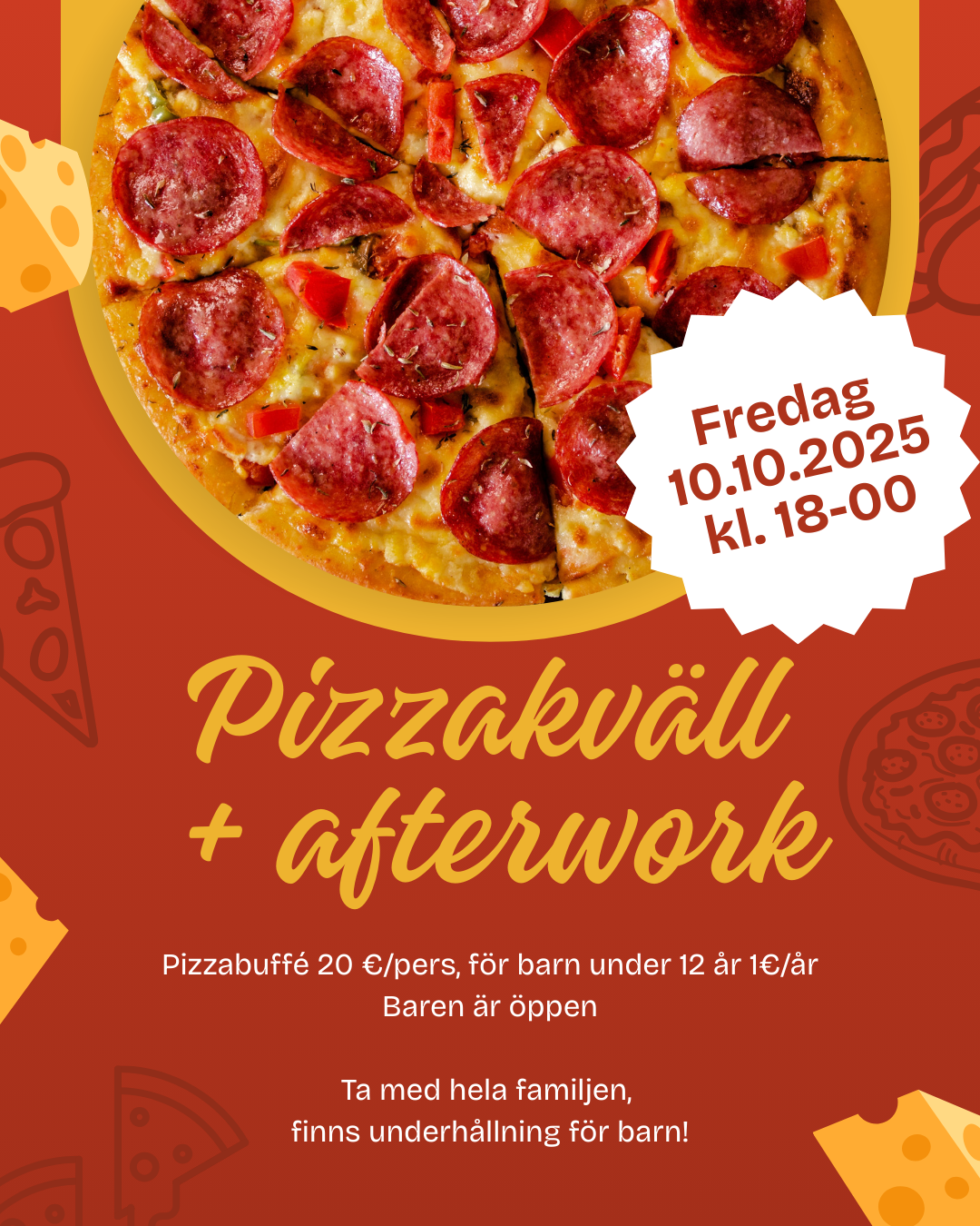 Fredagen den 10 oktober sätter vi vår pizzaugn i arbete och ordnar en pizzakväll och afterwork kl.18-00. Pizzabuffén kostar 20€/pers, för barn under 12 år kostar det 1€/år.
